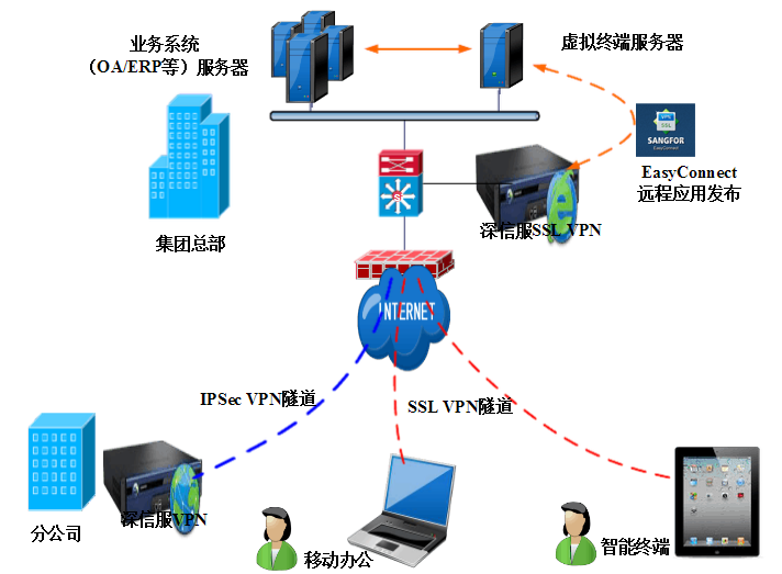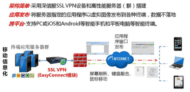 深信服EasyConnect远程应用发布解决方案通过SSL VPN和企业内网部署的终端服务器,将企业应用程序界面用图形的方式呈现于智能终端之上。在部署过程中,无需对现网结构和应用程序做任何改变,轻松实现跨平台访问,解决企业用户通过iPhone、iPad、Android等智能终端访问的问题,实现业务数据快速迁移,同时保障业务系统数据不落地,存储在终端服务器,同时根据本地用户习惯,融入本地输入法、打印机、本地签名等提升用户使用便捷度。