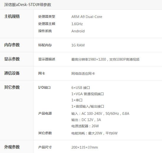 瘦终端aDesk:外观小巧精致,采用ARM架构和A9芯片,性能强劲,处理速度快。