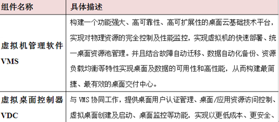 虚拟桌面控制器VDC:提供桌面用户认证管理、桌面/应用资源访问控制、虚拟桌面创 建及启动、桌面监控等功能,实现以更低成本、更安全、更可靠地交付Windows桌面;需与VMS协同工作,并提供软件和硬件两种类型。